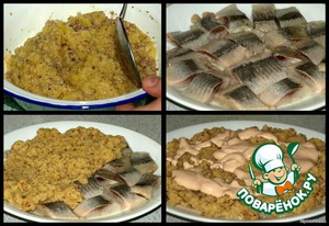 Закуска из книги В. Похлебкина "Моя кухня". Очень интересный "букет" - сочетание соленого, сладкого и кислого. Единственный недостаток: готовое блюдо не может долго стоять, яблоко дает сок и блюдо теряет "товарный вид", НО НЕ ВКУС! Для любителей необычного...