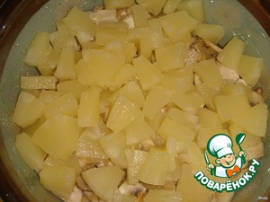 Филе и грибы с луком выложить в глубокую кастрюлю. Добавить порезанные кубиками ананасы.