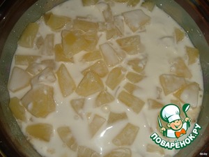 Сок из ананасов смешать со сметаной и залить заправкой мясо.