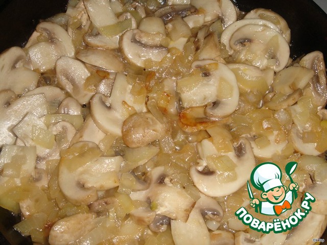 Лук мелко порезать, обжарить на растительном масле. Добавить порезанные пластинками шампиньоны и жарить 5 минут.