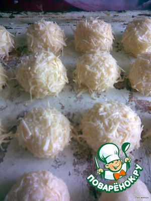 из готового манного теста скатать шарики, обвалять их в тертом сыре и выпекать в духовке 25-30 минут при температуре 220 градусов. Они должны подрумяниться.