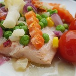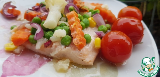 Рыбу выкладываем в кастрюльку, сверху овощи, заливаем кипятком и на очень слабый огонь. Мука от рыбки даст необходимую густоту соусу.