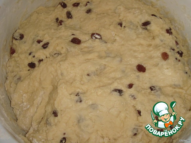 В подошедшую опару добавить желтки перетёртые с сахаром, взбитые белки, ванильный сахар, размягчённый маргарин, муку и изюм. Хорошо вымесить (тесто не должно быть слишком крутым) и поставить на 1 час в тёплое место, что хорошенько поднялось тесто.