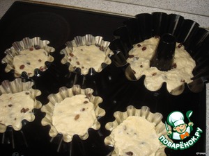 Подошедшее тесто разложить по формочкам и дать ему ещё постоять в них 20 минут.
