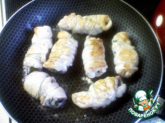 Обжаривать до золотистой корочки с двух сторон на растительном масле, потом уменьшить огонь и оставить потомиться рулетики минут 10 -15.