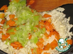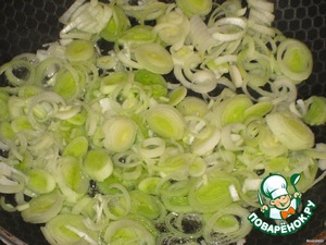 Лук-порей и морковь порезать тонкими пластиками и быстро слегка обжарить на оливковом масле.