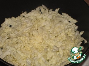 Пекинскую капусту нашинковать. Сложить в казан или кастрюлю с толстым дном, в которой вы делаете плов. Налить чуть водички и потушить 5 минут под крышкой.