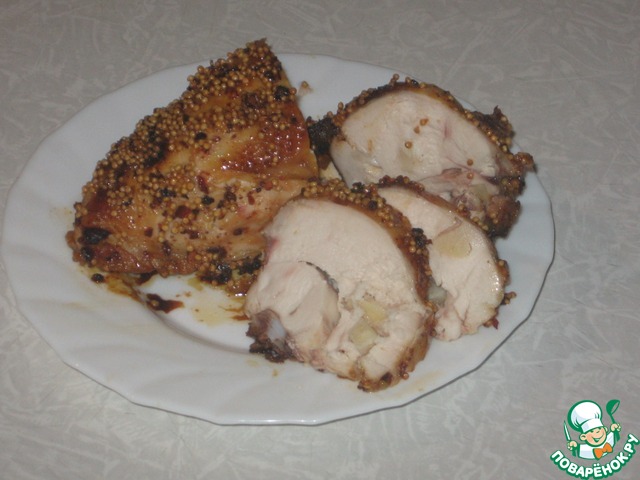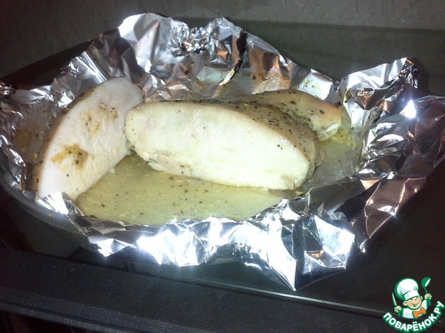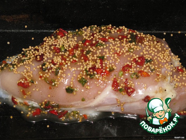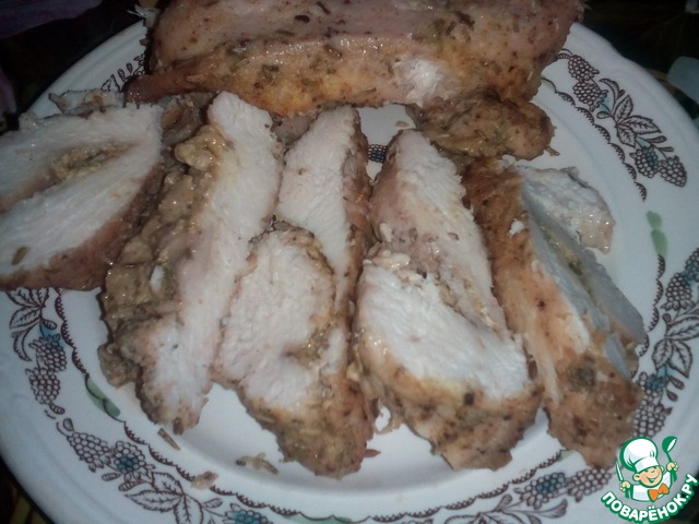Грудку замачиваем в соленой воде на 2 часа(если грудка куриная, она поменьше, можно держать 1,5 часа, если же сильно большая, то можно сделать инъекции из соленой воды )..Вода должна быть соленой, но не горчить. Нашпиговать мясо чесноком.
