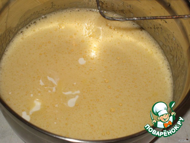 Яйца взбить с сахаром, очень тщательно, пока не увеличится масса в два раза, минут 5-8.