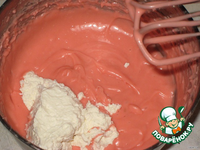 Затем достать, смешать с творогом и сахарной пудрой и все вместе взбить миксером 3-5 минут.