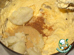 Затем добавить картофельное пюре, имбирь и мускатный орех, взбить 1 минуту, чтобы масса стала равномерной и однородной.