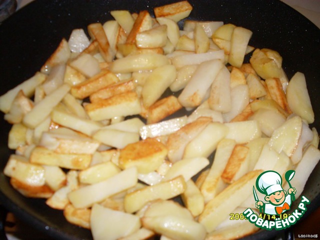 Картошку режем брусочками и обжариваем на сильном огне до полу-готовности и румяного цвета