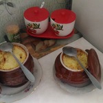 Укладываем в горшочки и заливаем смесью из сметаны и соевого соуса.Доливаем в каждый горшочек немного горячей воды и ставим в духовку. Запекаем при температуре 200гр. 30-40 мин.