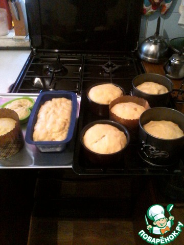 Когда тесто в формах поднимется вот так, можно ставить их в разогретую до 200 градусов духовку. Первое время духовку не открывать.