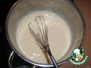 Далее варим заварной крем: 2/3 стак. молока+сахар ставим на огонь и доводим до кипения, но не даём закипеть.В отдельной посуде смешиваем оставшееся молоко+яйцо+муку и выливаем тонкой струйкой при непрерывном помешивании, доводим до кипения и снимаем с огня.Даём крему остыть, добавляем сок половины лимона и цедру половины лимона+размягчённое сливочное масло, взбиваем до однородной массы.