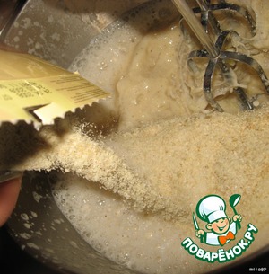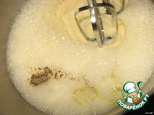 • Меняем на миксере насадку и добавляем постепенно муку, чтобы тесто стало погуще, примерно пол стакана, может чуть больше... тесто должно выкладываться ложкой.