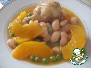 Добавить фасоль, горошек, манго (или персик) и после закипания протушить еще минут 5-10.