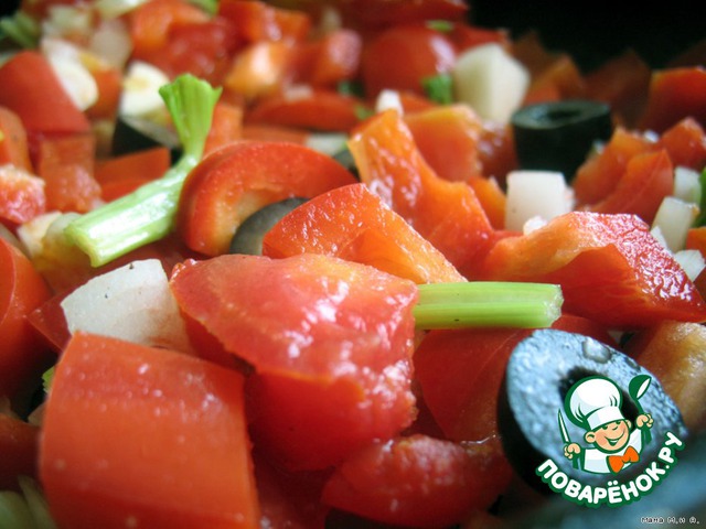 Баклажаны промыть от соли и отжать. Разогреть масло, обжарить оливки, перед, лук, помидоры, чеснок и сельдерей в течение 3 минут.