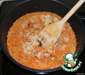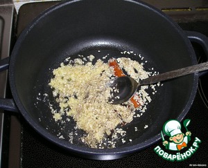 Теперь всыпьте рис и обжаривайте его несколько минут, пока зерна риса не станут слегка прозрачными.