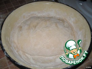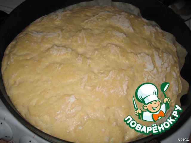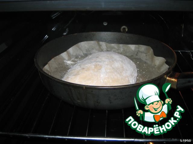 Тесто кладем в форму ( я использовала сковороду, в ней же и пекла). И даем подняться. Ставим в самое теплое место, куда не будет проникать воздух. Я немного нагрела духовку и поставила туда тесто.