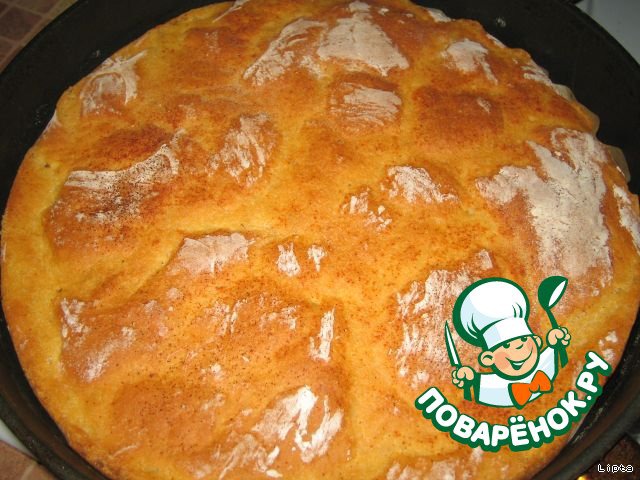 Через 40-60 минут тесто увеличится в 3 раза. Затем выпекаем. Тесто можно сформировать шариком и выпекать в высокой форме, тогда хлеб будет высокий, я выпекала в сковороде, хлеб у меня получился невысокий. Кто как любит. Выпекать при температуре 185 градусов 50 минут.