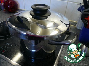 Добавляем стакан воды и тушим по крышкой 30 минут на слабом огне. Я для ускорения процесса варки накрыла моей АМС крышкой с эффектом скороварки. Мне понадобилось 10 минут, чтобы мясо стало мягким.