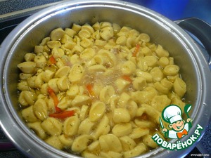 Раскатываем наше тесто в тоненькие жгутики, отщипываем кухонными ножницами маленькие клёцки прямо в кастрюлю. -