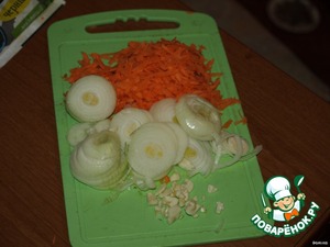 Трем морковь на терке, нарезаем лук кольцами, чеснок тоже мелко режем.