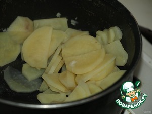 Чистим картофель и режем его ломтиками. Отвариваем в подсоленной воде 5-7 минут до полуготовности.