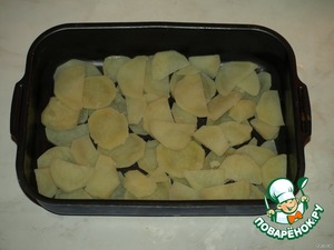 Выкладываем на дно посуды для запекания половину картофеля.