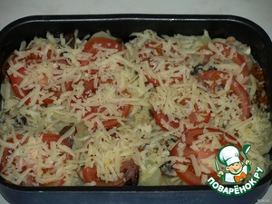Выкладываем тоненькие ломтики помидора и присыпаем все это сыром (сыра нужно немножко, чтобы выглядывающий помидор тоже поджарился)
