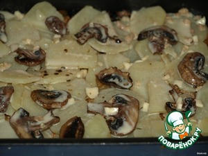 Далее выкладываем еще слой картошки, сверху кладем грибы и заливаем все это соусом.