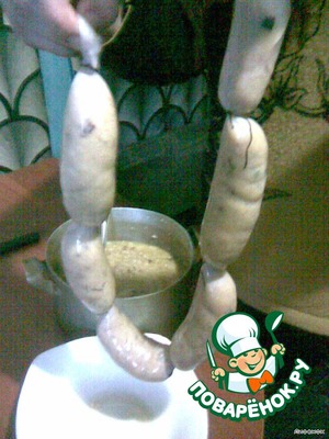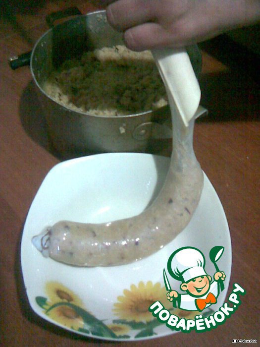 кишку натянуть на насадку от комбайна(есть специальная для домашней колбасы).Один конец завязать ниткой.