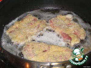 Берем отбивную, обмакиваем в яйце, затем в орешках и обжариваем с двух сторон на растительном масле.