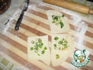 Раскатать тесто в пласт как можно более тонкий и нарезать квадратами. На каждый кусочек теста выложить немного начинки. Края теста смазать желтком и свернуть конвертиком.