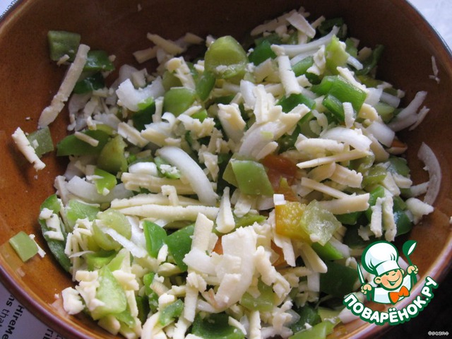 Болгарский перец очистить от семян (у меня был замороженный) и порезать квадратиками. Лук нарезать тонкими кольцами. Посолить, поперчить, и смешать с тертым сыром.