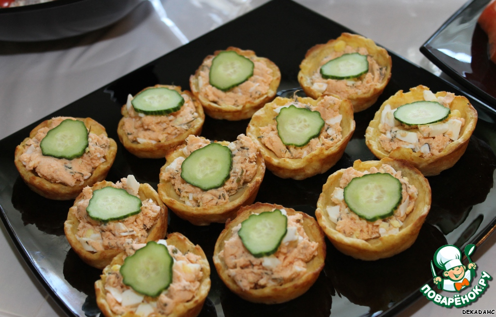 Намазать паштетом бутерброды, тарталетки (я использовала готовые вафельные корзиночки), украсить по желанию и подать к столу.