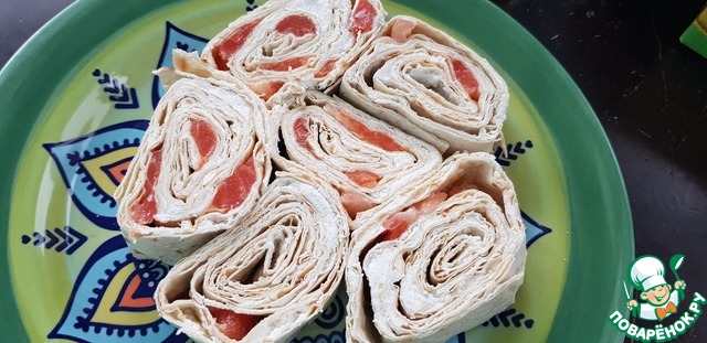 Взять 3 тонких листовых армянских лаваша, баночку плавленого сыра (желательно виола), грамм 150 соленой красной рыбки (семга, форель и т. д.. Первый лаваш равномерно намазать половиной сыра, сверху положить второй лаваш, на него равномерно разложить тоненько нарезанную предварительно рыбку. Сверху третий лаваш, который тоже намазываем оставшимся сыром. Сворачиваем все это в рулетик и в холодильник мин на 40. После чего нарезаем на порционные кусочки и украшаем зеленью. Приятного аппетита!!! ; -)