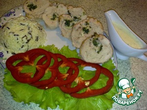 При подаче рулет выложить веером, подавать с соусом, отварным рисом и овощами