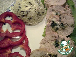 Рулет из индюшиного филе с моцареллой и шпинатом, с чудесным сливочным соусом и отварным полудиким рисом. Оригинальное праздничное блюдо, подойдет также и для повседневного ужина. Может кому приглянется. Заходите и отведайте