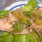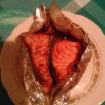 На такую же лодочку из фольги положить нарезанный кольцами (или кубиками) лук,сверху рыбка,на рыбку мед,и наконец-долька лимона!