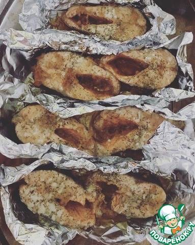 Вырезаем квадраты из фольги. Я еще сверху кладу полоску пергаментной бумаги (Что бы рыба не приклеилась к фольге)Каждый кусочек обмакиваем в соус и выкладываем фольгу. Сворачиваем фольгу в виде лодочки и распределяем оставшийся соус по порциям