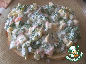 • Приправляем нашу смесь перчиком, добавляем майонез и выкладываем горкой на куски хлеба