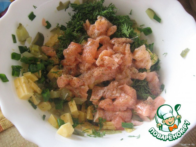 • Огурцы и сыр нарезаем кубиками, рыбу режем мелкими кусочками, измельчаем зеленый лук и укроп