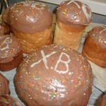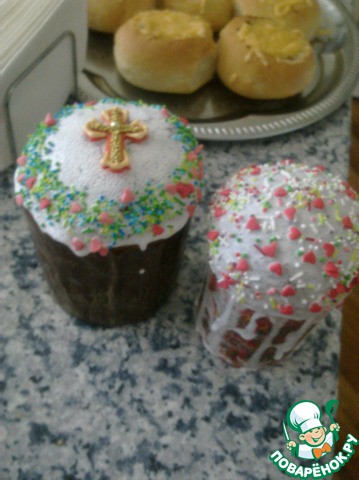Куличи с кусочками шоколада и орешками, шоколад был чёрный с коньяком, а молочный с ромом, и вам советую, готовый кулич внутри весь пропитался запахом шоколада и его содержимого, да ещё и сверху шоколад.. просто не передать словами.