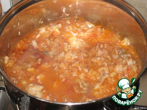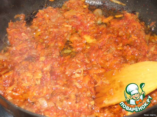 Когда овощи обжарятся залить их томатом и немного прокипятить.
