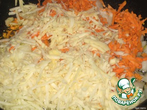 В сковороде в растительном масле обжарить натертую на крупной терке морковь, нарезанный лук и пастернак.
