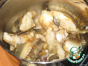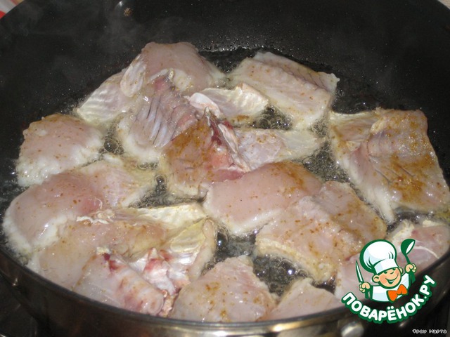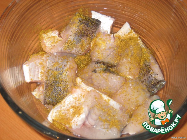 Рыбу очистить, выпотрошить, нарезать кусками, посолить, приправить специями для рыбы.