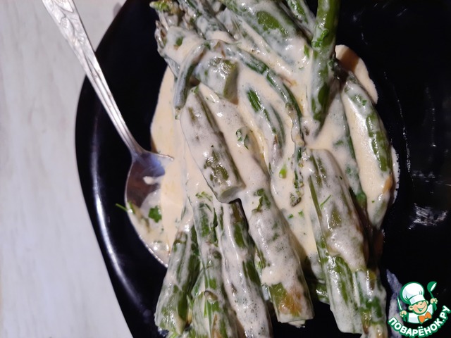 В итоге - нежный соус, вкусная мягкая спаржа, отличное сочетание с рисом, а также свиной поджаркой.