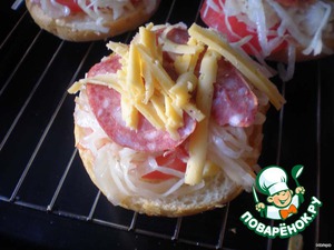 Посыпать тертым сыром. Накрыть верхушкой булочки.